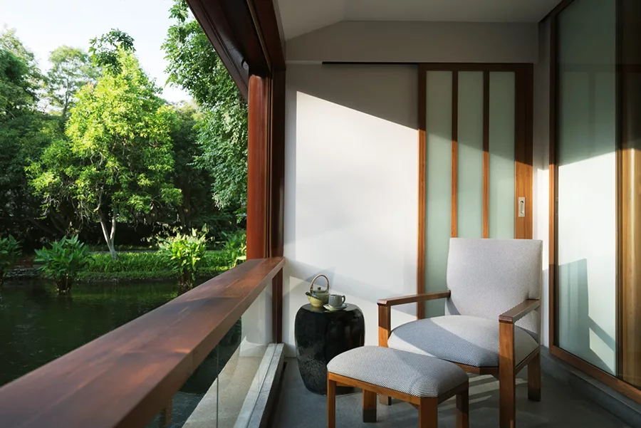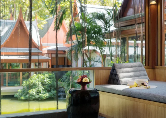 The bedroom opens onto a screened private terrace, where gentle garden sounds support a calm, restorative state of mind. Often highlighted among high-end wellness resorts in Thailand, this pavilion-style suite appeals to international travelers looking for a refined wellness retreat that feels immersive, peaceful, and connected to nature.