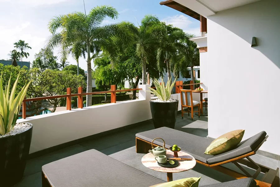 The bedroom and living area flow seamlessly onto a long private terrace with loungers, encouraging slow moments outdoors. As one of the largest standard rooms, Anchan is often recommended among luxury wellness resorts in Thailand for international travelers seeking a refined yet relaxed wellness stay surrounded by nature.
