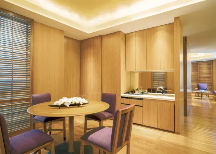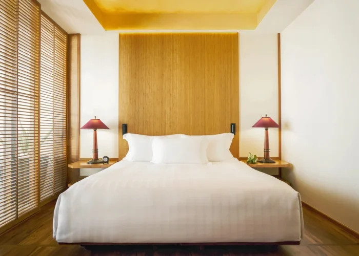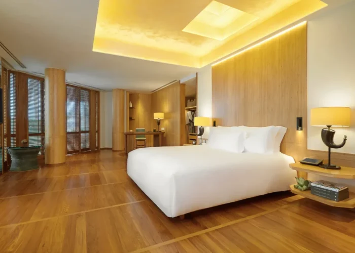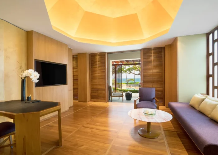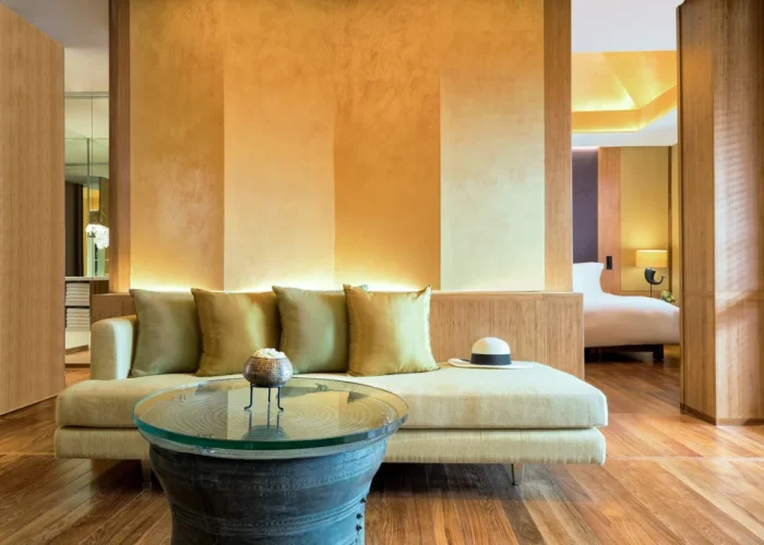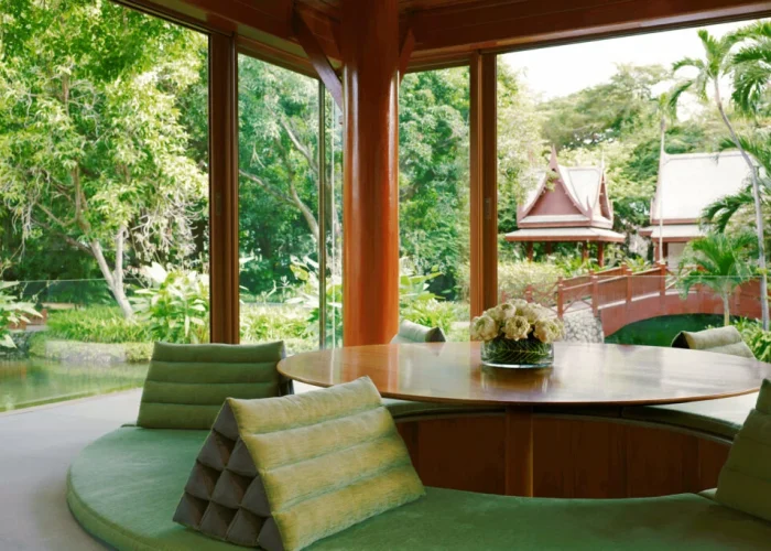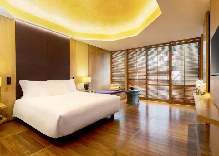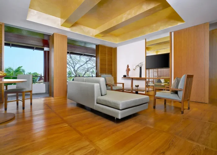 The interior reflects authentic Thai elegance through silk, teak, and bamboo details, complemented by separate living, dining, and dressing areas. Often recommended among high-end wellness resorts in Hua Hin, this suite appeals to international travelers looking for a premium wellness stay that feels serene, culturally rich, and quietly luxurious.