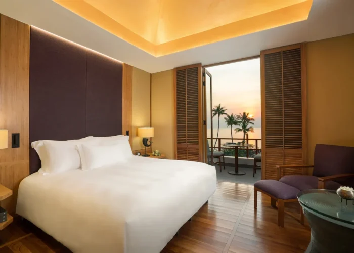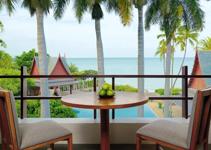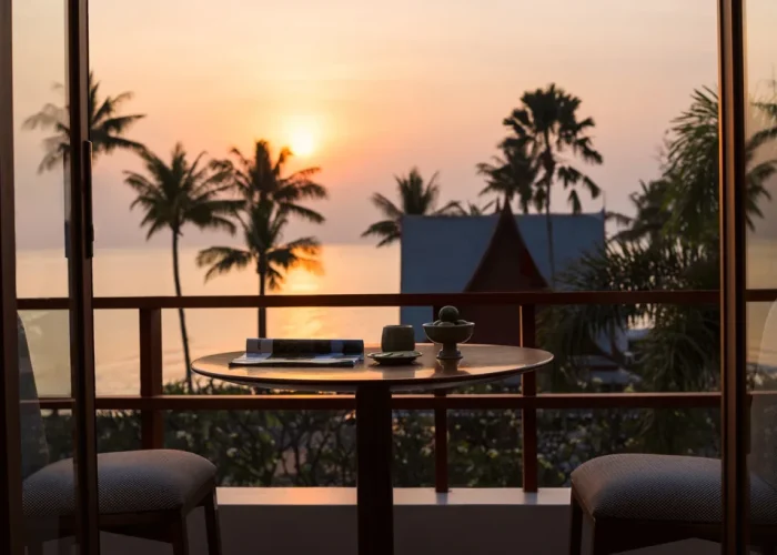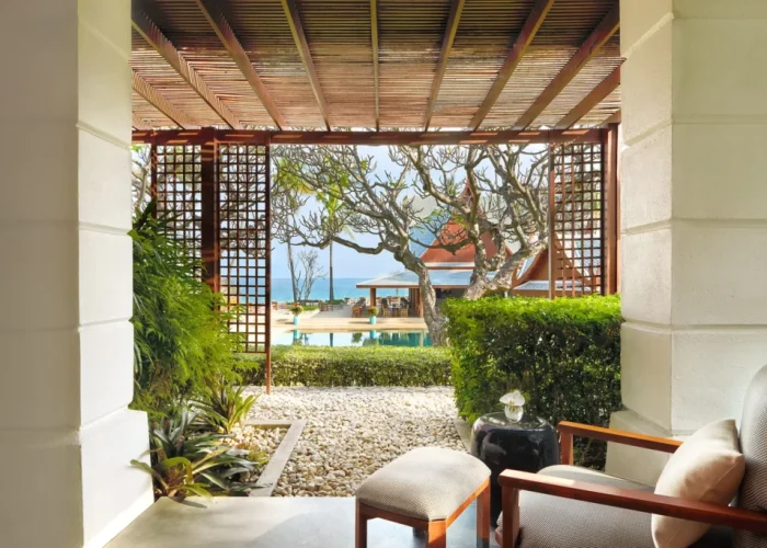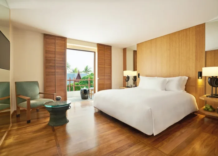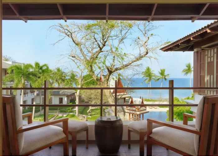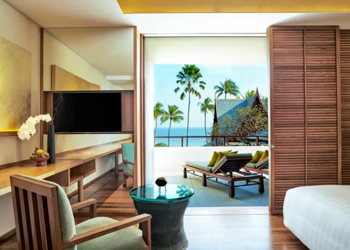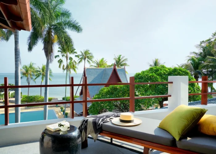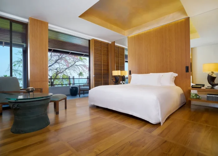 A wide private terrace opens to uninterrupted views of the sea, creating a peaceful setting for rest and reflection. Often recommended among high-end oceanfront wellness resorts in Thailand, this room appeals to international travelers looking for quiet luxury, space, and a deeply relaxing coastal atmosphere.