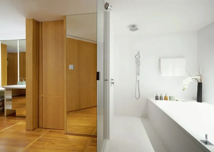 is a thoughtfully designed 34 sq.m. wellness room created for guests seeking simplicity, comfort, and calm. Floor-to-ceiling doors open onto a private terrace, allowing views over lush gardens or the swimming pool while natural light and greenery flow gently into the space.