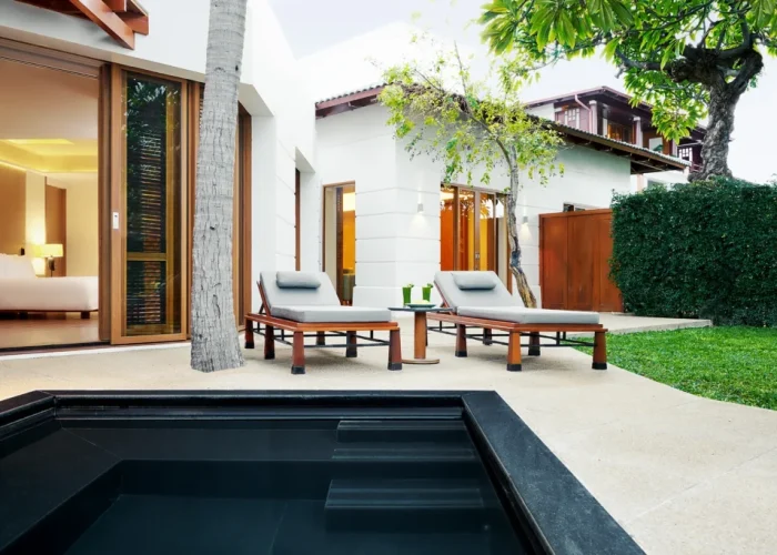 is an intimate 66 sq.m. wellness suite set within lush tropical gardens, offering a secluded stay away from the main resort buildings. Surrounded by greenery, the space feels naturally quiet and grounding, ideal for guests seeking deep relaxation in a nature-focused wellness setting.