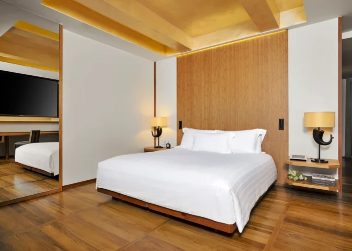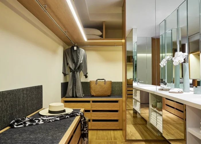 is an elegant 68 sq.m. wellness suite set on the top floor, known for its panoramic sunrise views over the resort’s leafy canopy. A private terrace opens directly from the bedroom, inviting early morning light and a calm connection with nature.