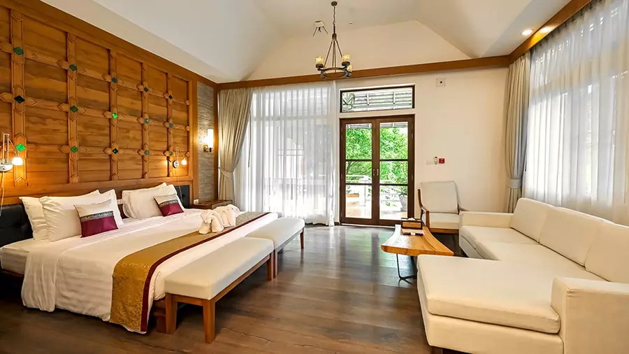 Nestled beside a serene pond, the four elegant villas provide peace and tranquility for true relaxation. Each villa room features a private 20 m² terrace, a cozy seating area, a writing desk, and a spacious bathroom.